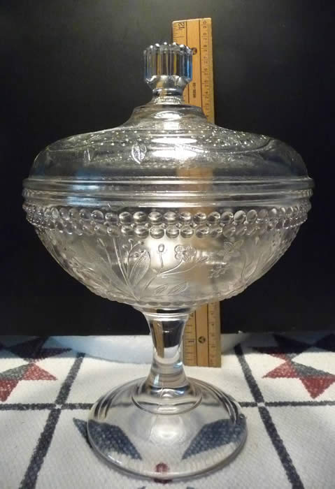 This pattern, sought after by all collectors of Canadian pressed glass, was made by the Nova Scotia Glass Co. in Trenton Nova Scotia in the late 1800's. It was made in a wide range of products: sugar bowls, cream and milk jugs, water jugs, cake plates etc. I will be listing a cake plate separately.