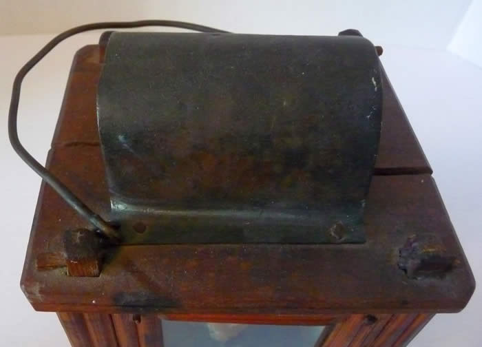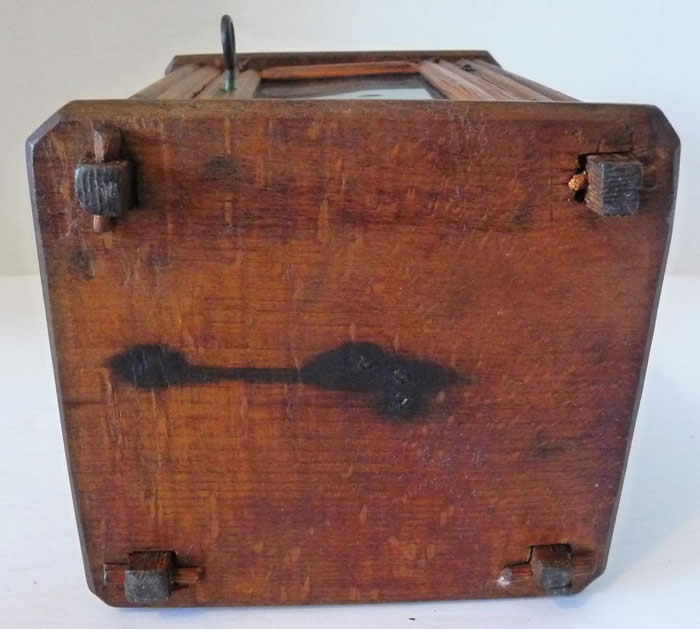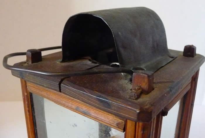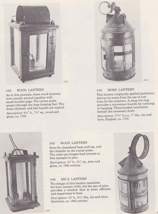 Reference: (See scan) These wood lanterns are usually pinned together with small wooden pegs. The corner posts project through the base forming feet. The dome chimney and bail handle are typical. p.33 Early Lighting A Pictorial Guide by the Rushlight Club