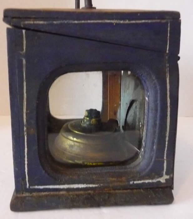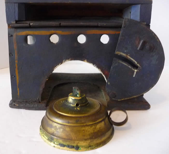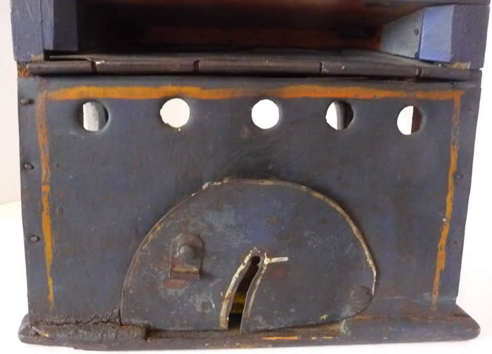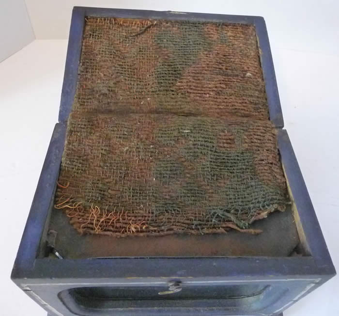 Inside this foot warmer is a brass kerosene font which would then be lit.. The top opens and the travellers put their feet on top (on the fabric) to keep warm. It is painted a dark blue with white trim.