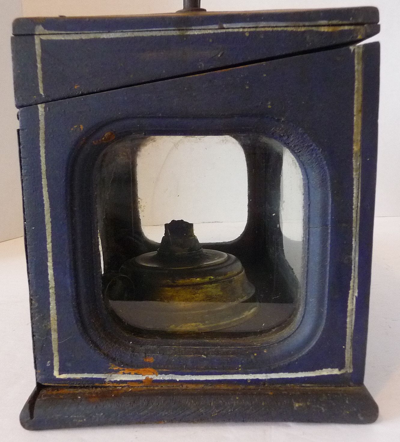 Condition: As found, wear as expected from age & use..no damage or repairs evident. Original paint and original bail handle. The lantern wick cannot be raised as it is missing a disk on the end of a rod that you turned the knob to raise and lower the wick. I think that the rotating tin disk with the slot in it, slid down over the wick handle to keep the lantern in