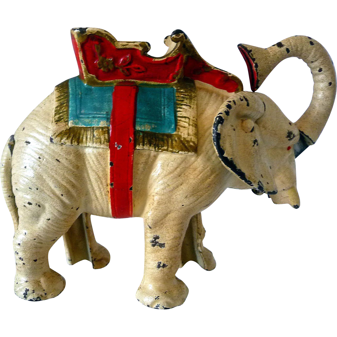 Painted Cast Iron Mechanical Pull Tail Elephant Bank American 1930's