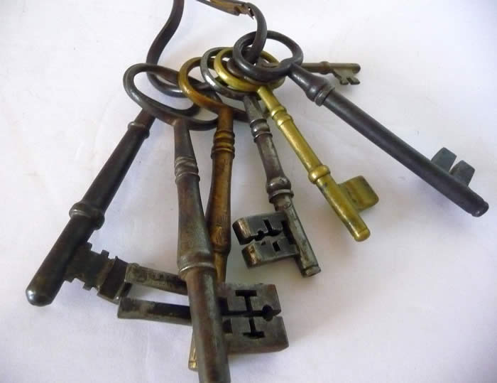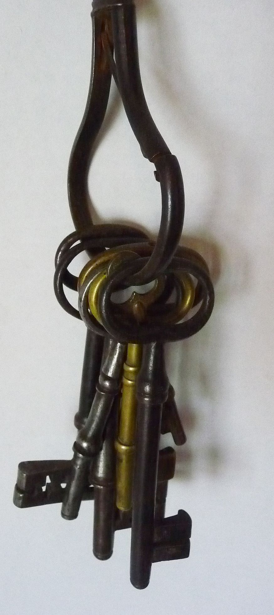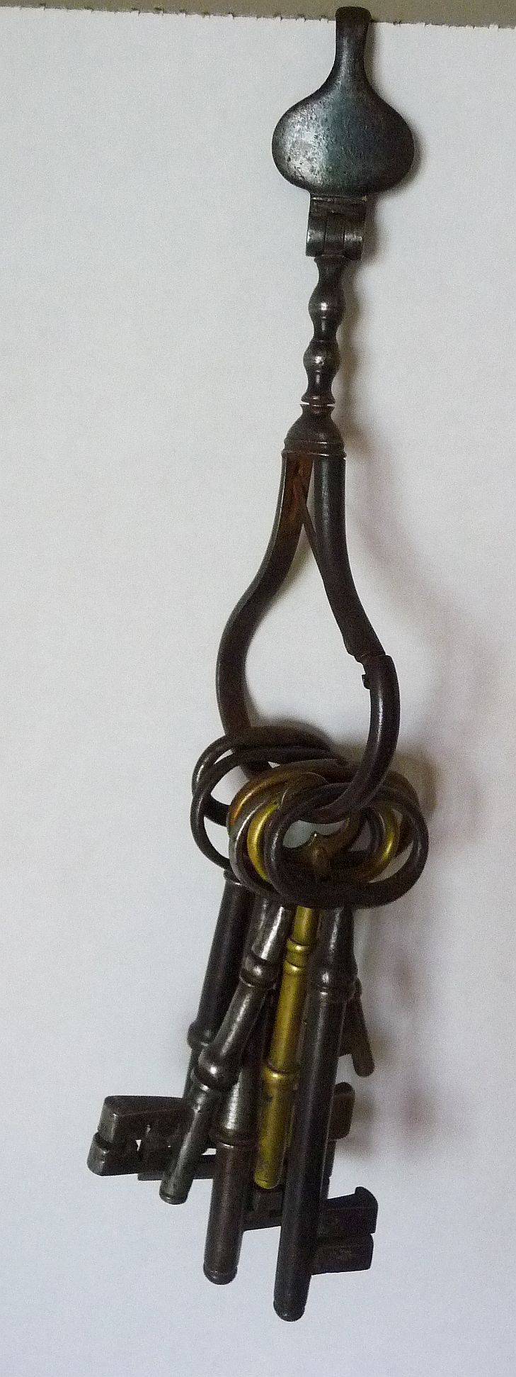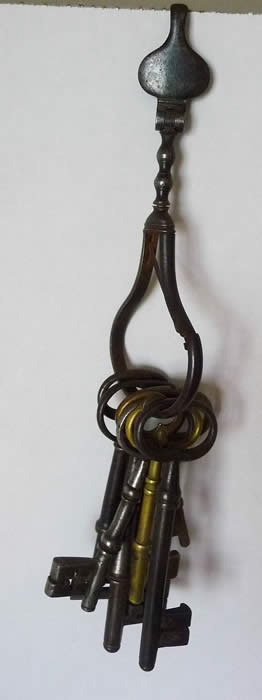 Forged Iron Spring Loaded Key Keeper and 7 Assorted Keys late 18th Early 19th C