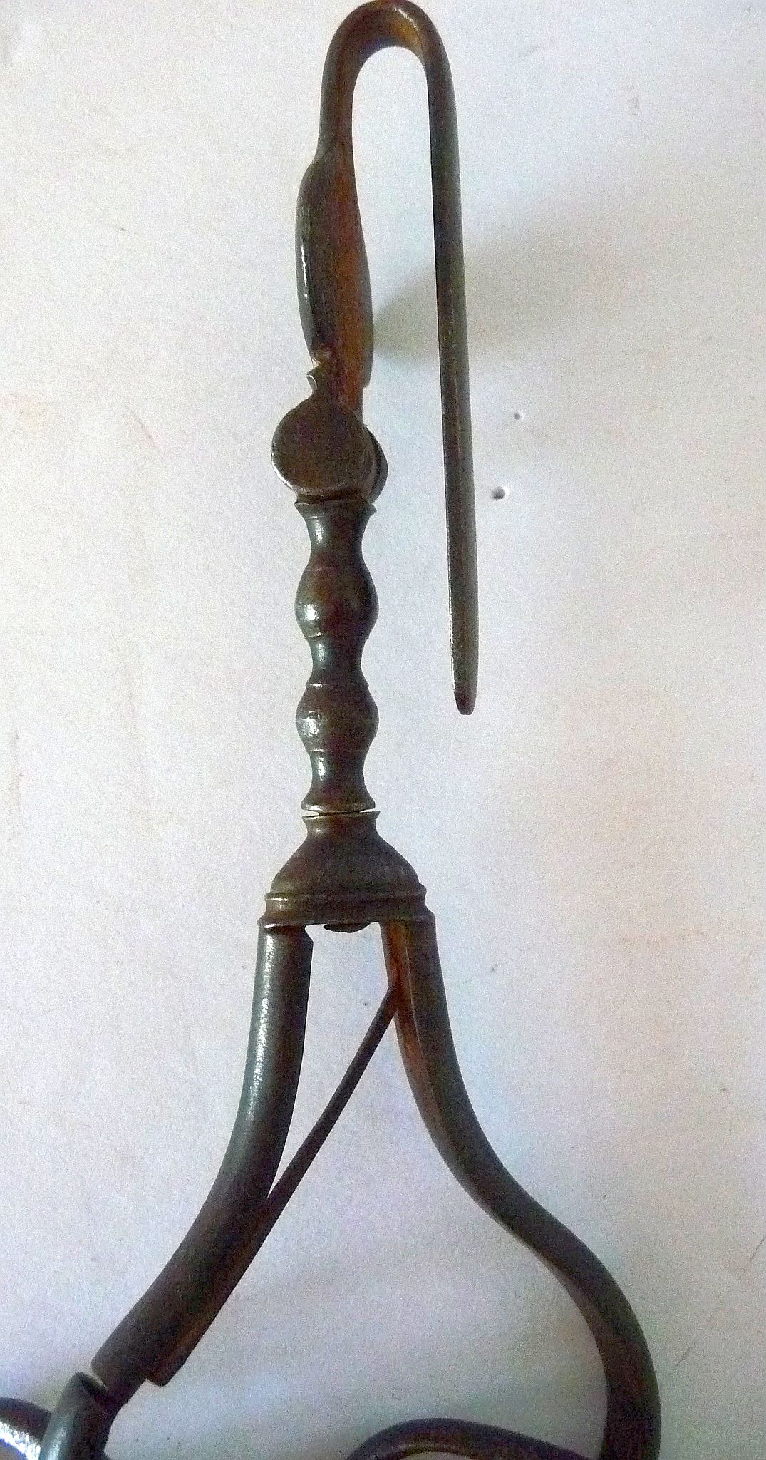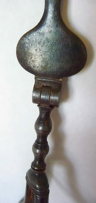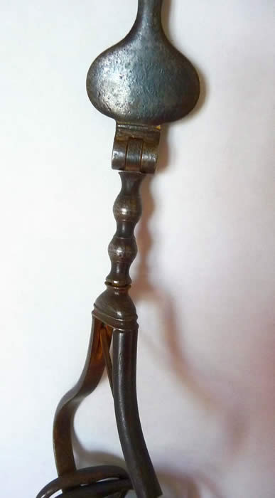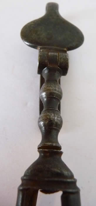 This rare early blacksmith made iron key keeper would have been clipped to a belt. It is spring loaded to open it. The blacksmith work is truly beautiful. Found in New Hampshire.