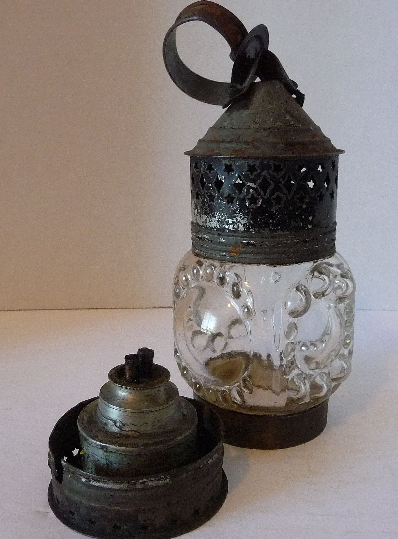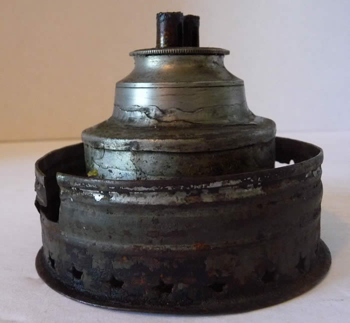 Removable font. Double whale oil burner. Pierced tin top and base.