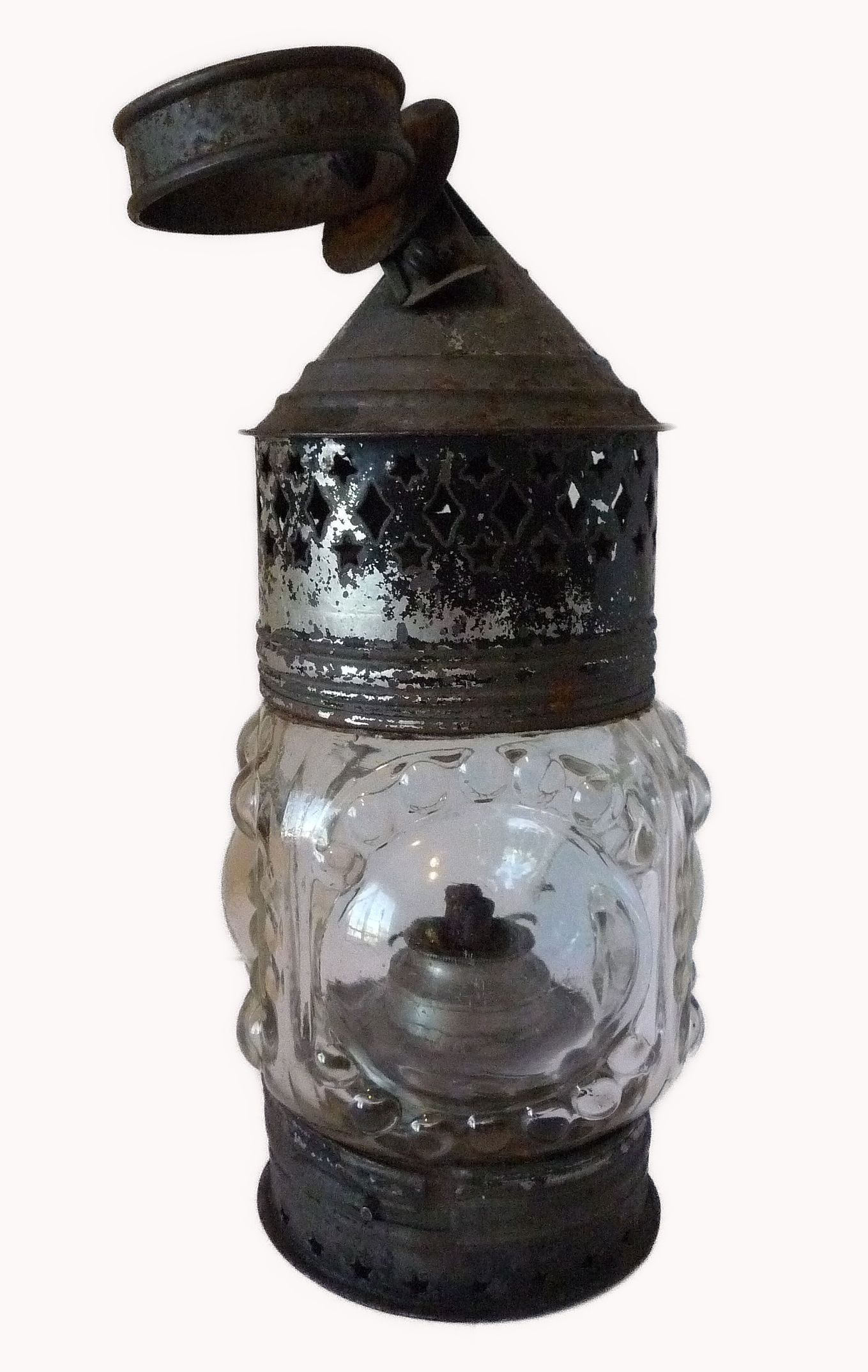 Pierced Tin and Blown Glass Bullseye Whale Oil Lantern mid 19th Century