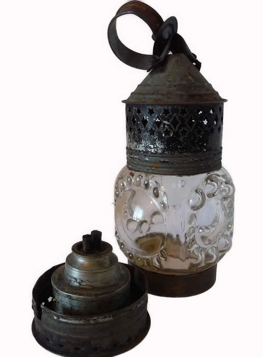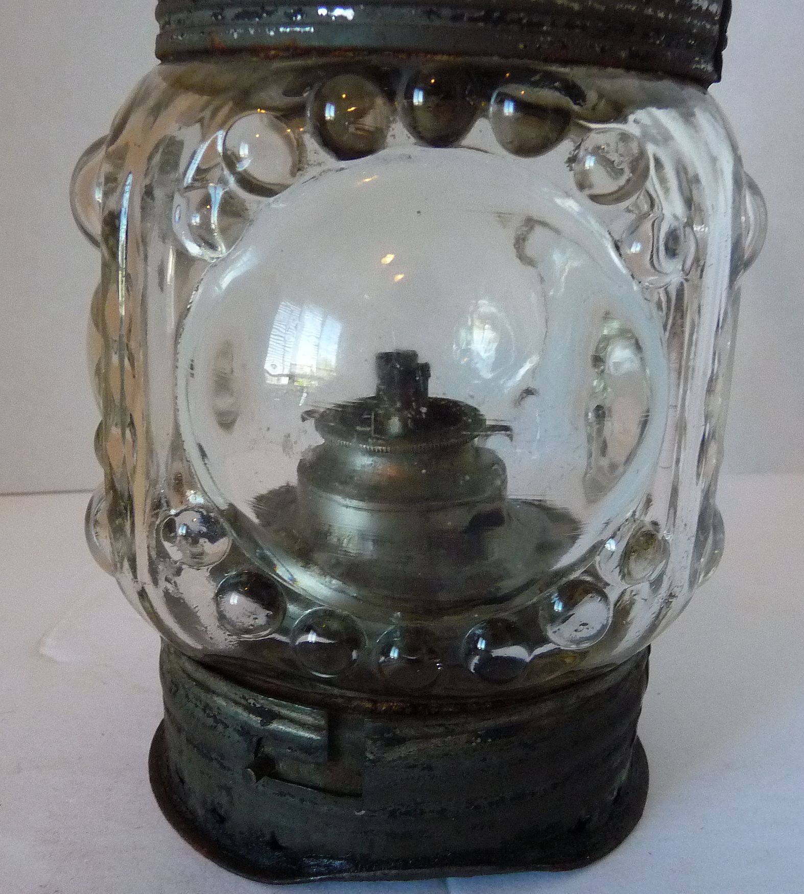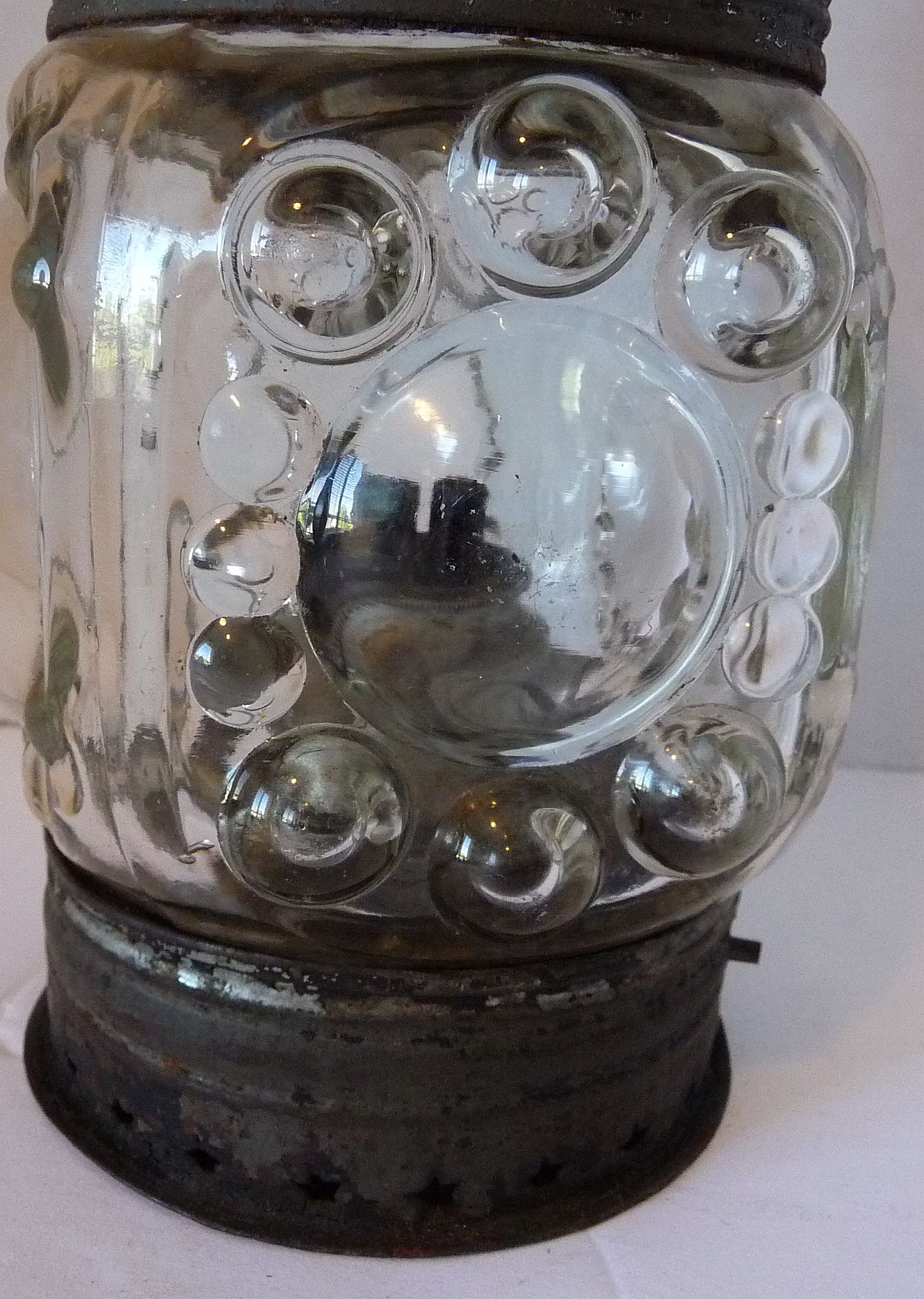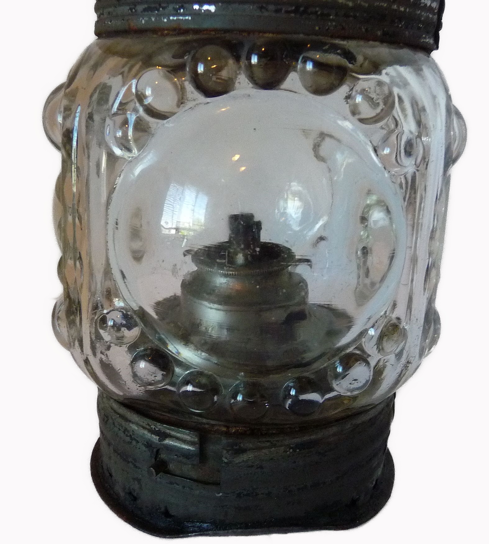 Unusual style of whale oil lantern, bulbous blown glass globe in 4 sections, each with a bullseye centre..