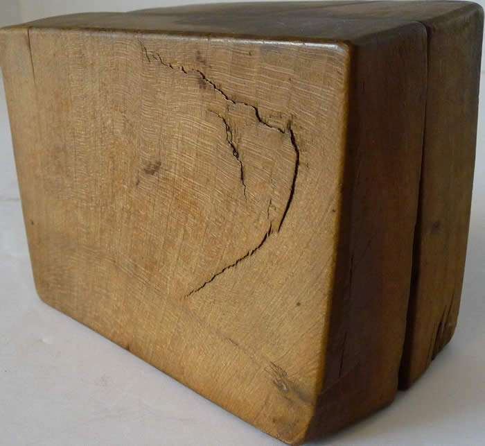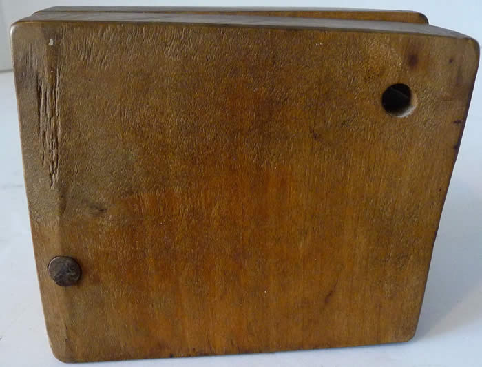 Two wooden pegs held the sides together to create a 3 dimensional butter mold (one peg is missing)