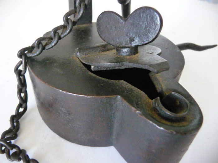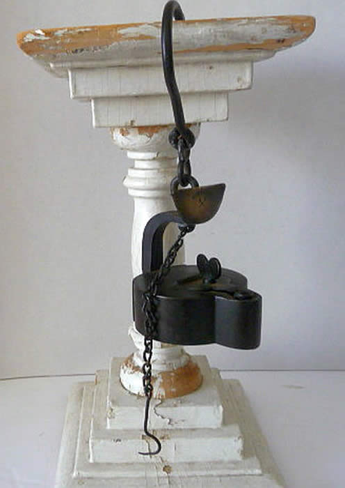This iron and brass miner's lamp was probably made in Westphalia Germany circa 1858. These lamps were exported to America from Germany. Most 'Frog Lamps' from Westphalia are characterized by a small lid in the top of the font. The lid is opened using a wing nut connected to a latch under the lid. Westphalia lamps have a hanging hook shaped like a question mark (Sheppard's hook). The heart shape semi-circular brass shield is marked 'GLUCK AUF' and decorated with crossed hammers. The latch handle is also heart shaped. Glück Auf; is the traditional German miners' greeting. It describes the hope of the miners: ("I wish you luck in opening a new lode"). The greeting also expressed the desire that miners would return safely from the mine after their shift. Reference: Frog Lamps Wendell E Wilson p.53 Condition: As found. No damage or repairs. See photos. Approximate Dimensions: (L) 4”, (H) 4”.
