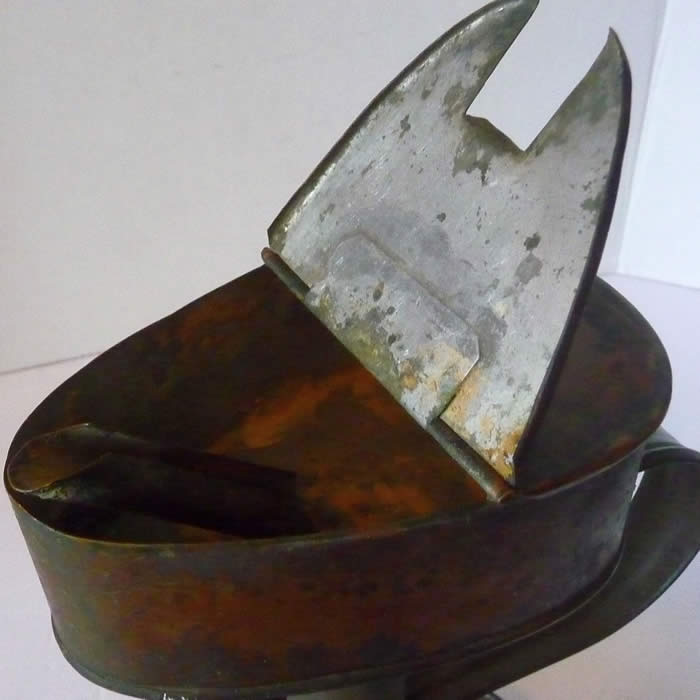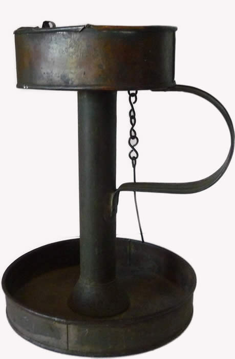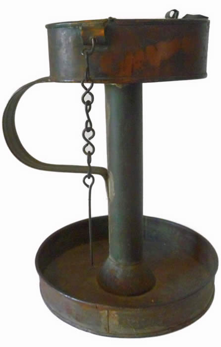 American 19th century Betty lamp made of tole The upper section is copper.. These lamps burned oil or grease with a twisted cotton wick that was placed in the internal 'wick support'. This lamp retains the original 'wick pick' used to pull the wick forward in the wick tube. When the lamp is firmly attached to the base, it is often called a 'Portsmouth Betty'. The design is believed to have originated in the Portsmouth New Hampshire area.