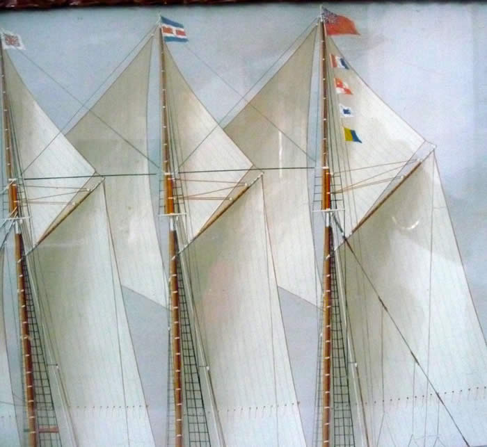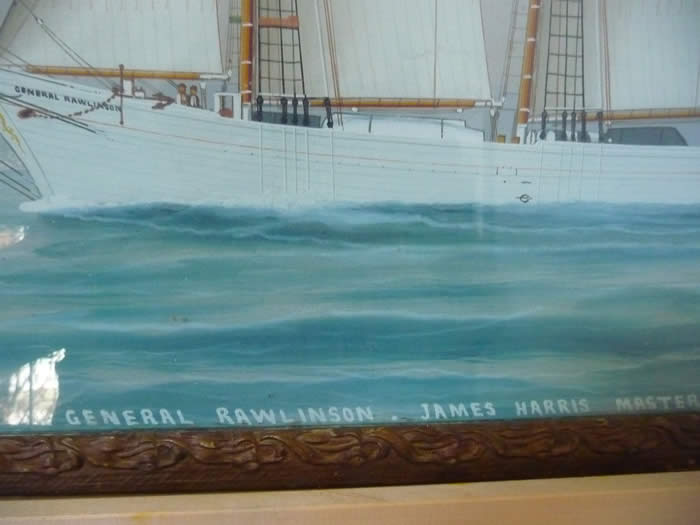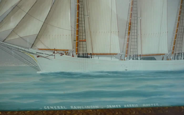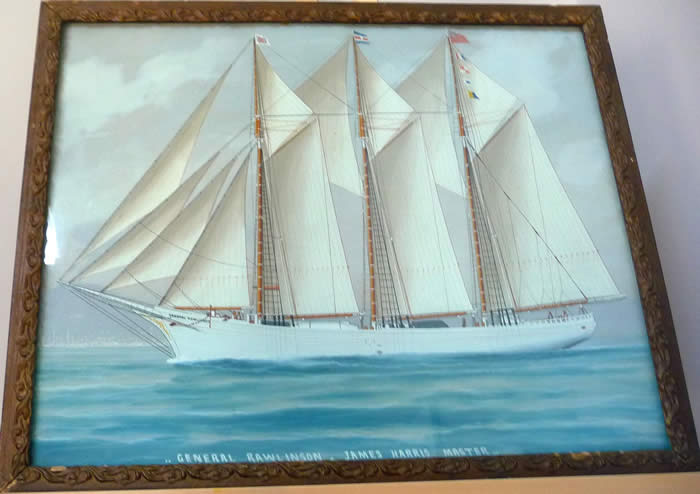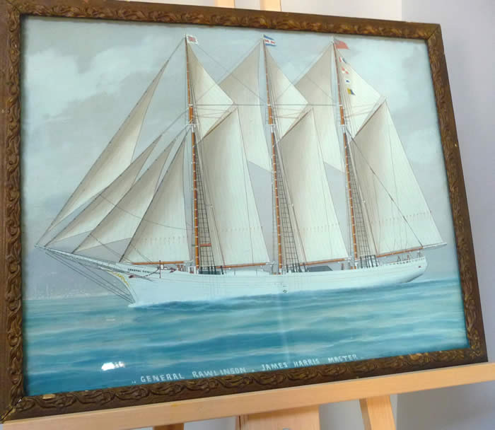 Watercolour painting on paper (under glass). Framed size 21" x 17". Unsigned by artist. As found. No evidence of damage or repairs. General Rawlinson, built in Marystown Newfoundland, was in the charge of Captain James Harris on a voyage in 1921-1922 to Oporto, Portugal. In a severe storm it struck against the dock, took on water, and sank. She was raised in July 1922 and eventually sold to be used by the Portuguese (renamed Pacos de Brando) as a Bank fishing vessel.