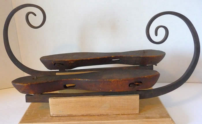 These beautiful handmade Antique Ice Skates, circa 1850's, have forged iron blades with VERY large curls - 6 " (one of the largest I have ever had for sale). Old original dark red paint.