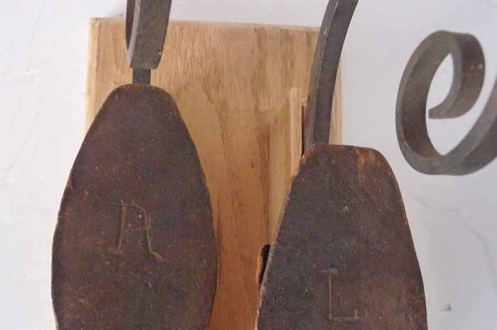 They are beautifully proportioned. The wood platforms are tapered in the middle. The screws at the heel are to prevent boot slippage. No makers marks evident. The footbeds are marked for (R) & (L)